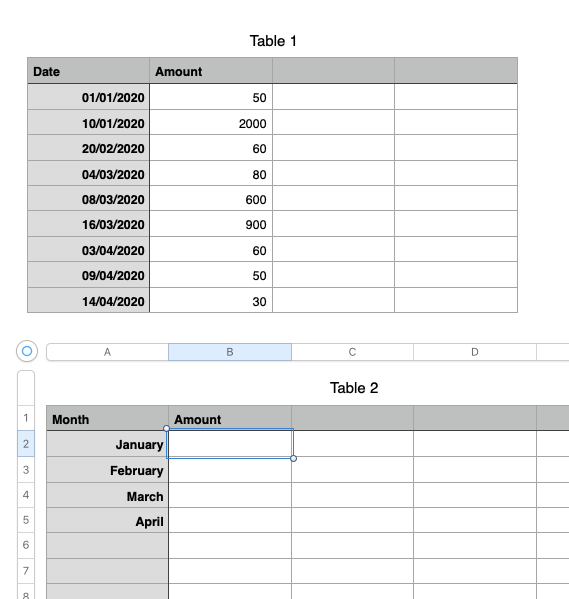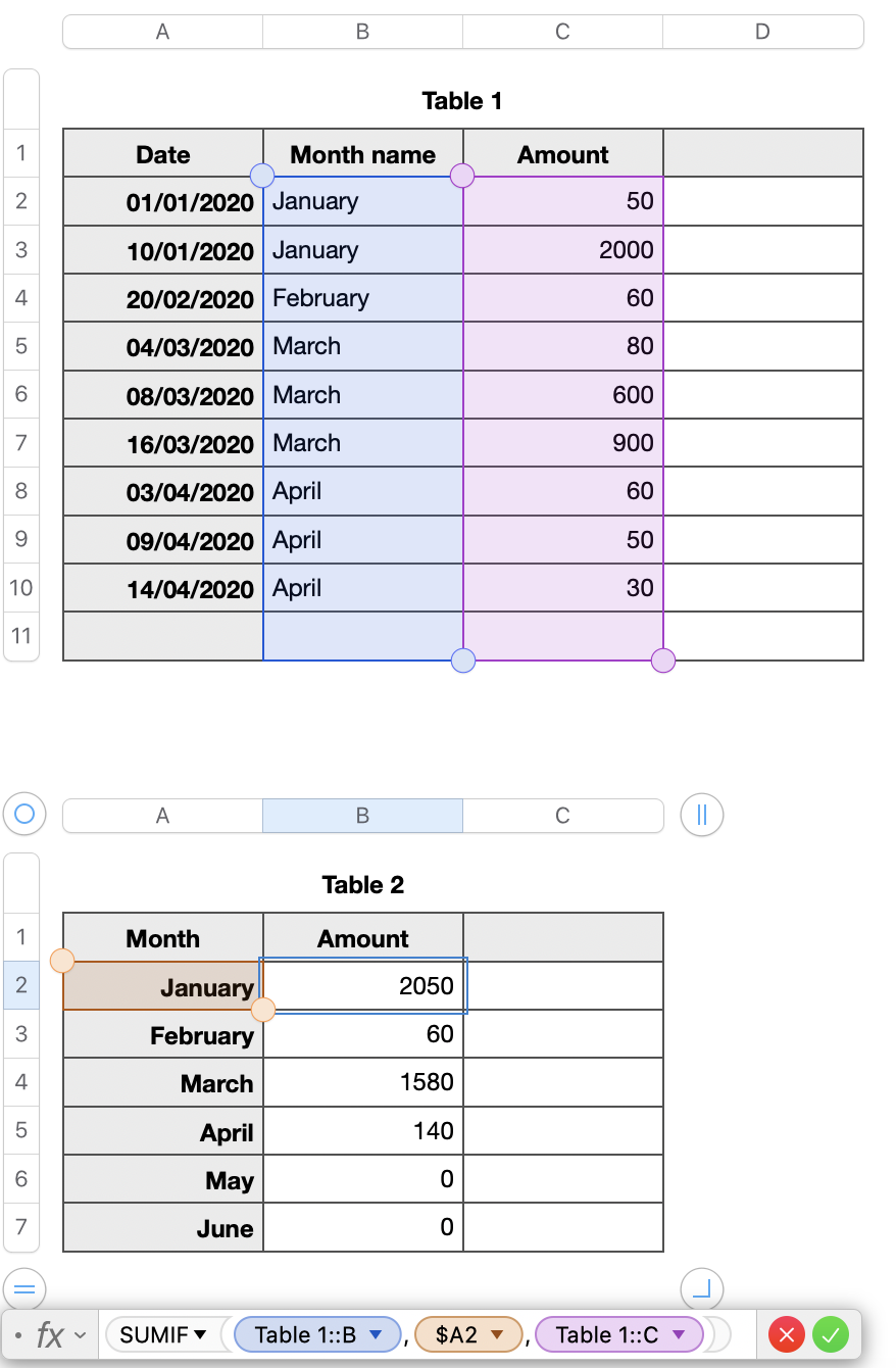 Formula in Table 2 B2 =SUMIF(Table 1::B,$A2,Table 1::C)