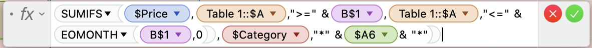 SUMIFS($Price,Table 1::$A,">=" &B$1,Table 1::$A,"<=" & EOMONTH(B$1,0),$Category,"*" &$A6& "*")