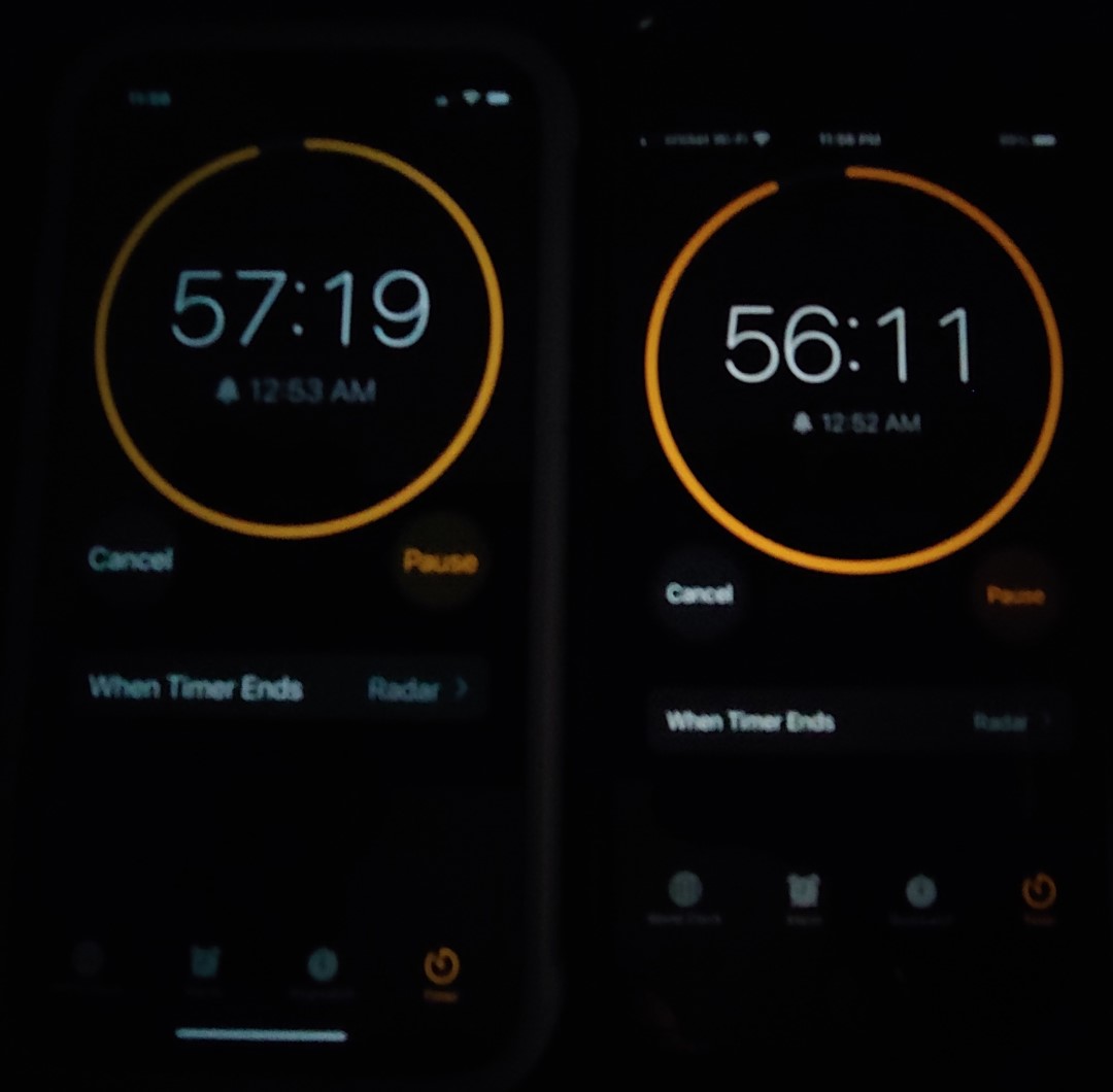 If the majority of iPhone 12 owners also feel this way probably gonna be waiting long time for fix if it is software related but guessing it's a combination of controller chip, also same reason for lack of high refresh rate screen, and QC issues as mentioned already! Anyways, already said I'm gonna return mine and stick with iPhone SE till they work out issues although going to miss night mode the most on the iPhone 12. But yeah green tint at lowest brightness unacceptable in current state since just noticed last night when I had the iPhone 12 next to the iPhone SE how much worse and dull the colors looked on the iPhone 12 compared to the SE just using Apple's own apps like the timer as you can see in picture below! Totally unacceptable having worse image quality on a phone that cost like 3x as much! The iPhone SE on right displays the correct or at least I"m guessing correct orange ring color around the time vs the yellowish ring on left of iPhone 12 due to green color mixing! and can't see it too good in this pic but the grey bar around when timer ends text also has noticeable green hue on left compared to perfectly grey looking bar on right.
