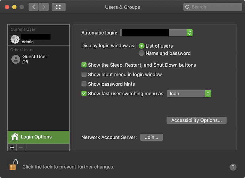 Have unlocked the lock at bottom of window, but still no wording or choice for automatic login