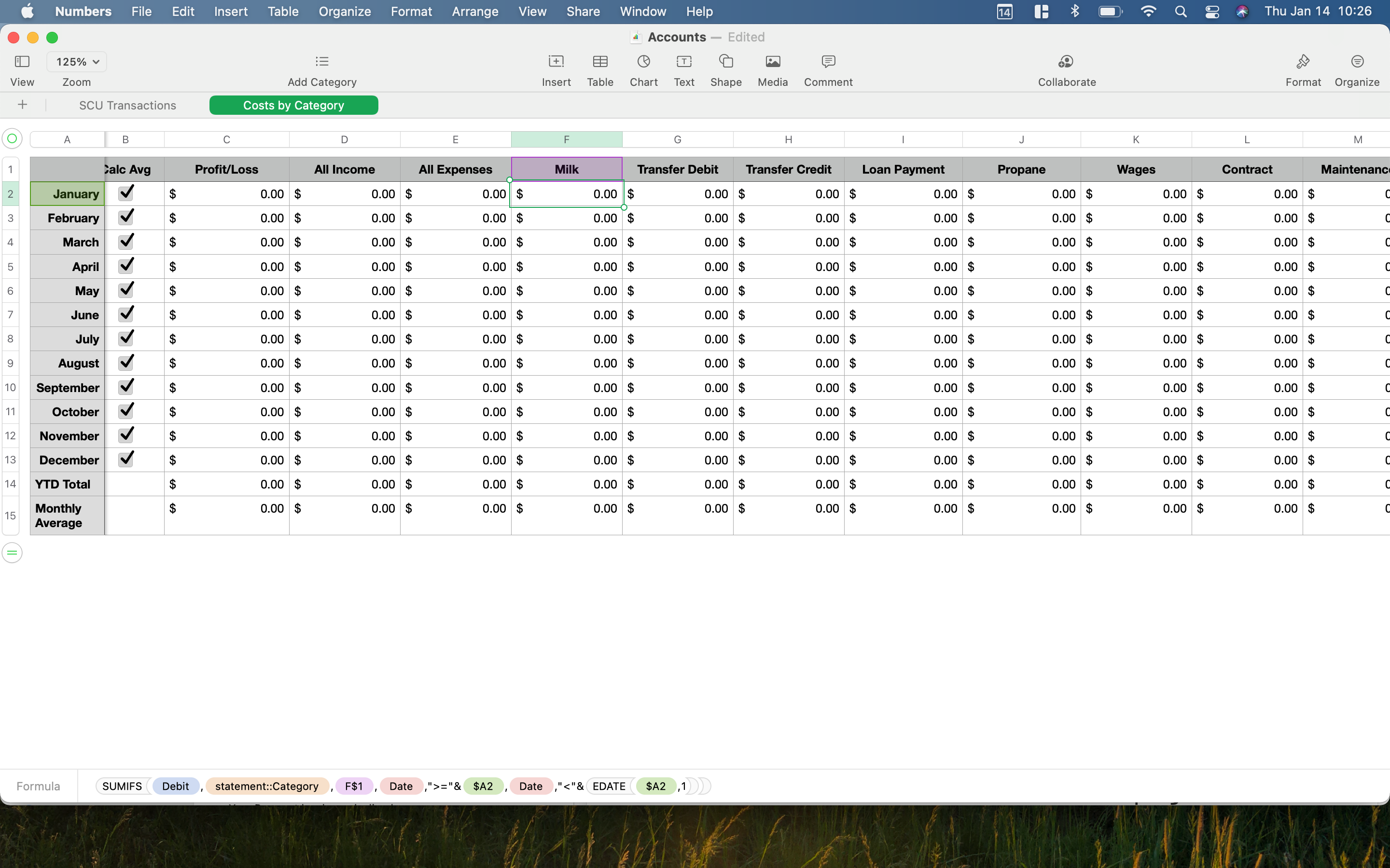 SUMIFS(Debit,statement::Category,F$1,Date,">="&$A10,Date,"<"&EDATE($A10,1))