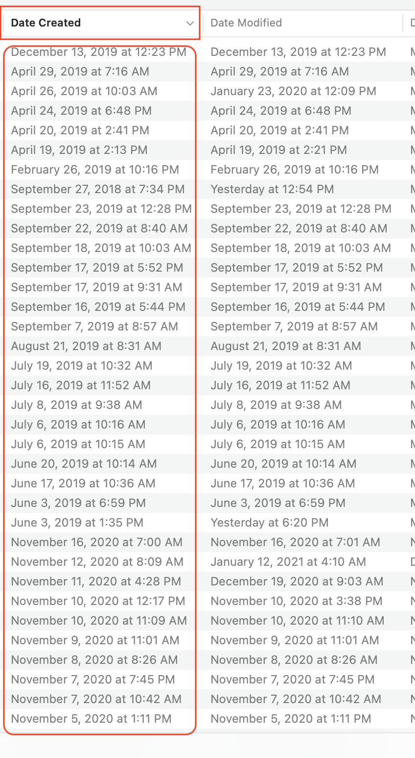 After the new year, when I try to order files by 'date created', it shows everything from 2020 backwards by year in alphabetical order and no longer by month, as is the case of files created in the current year.