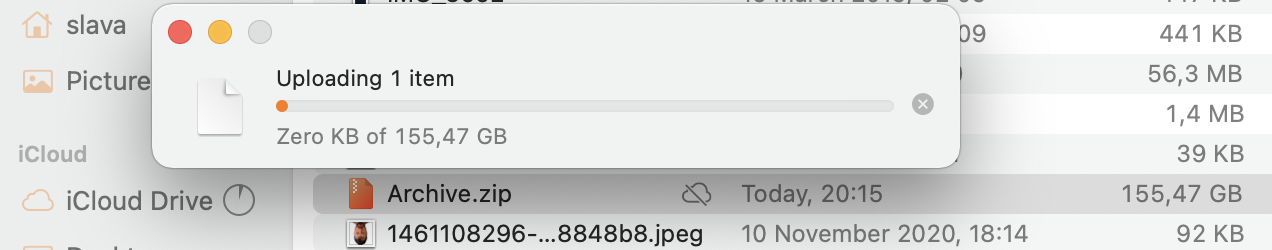 I've place a huge archive, about 155Gb, in iCloud Drive folder. But it cannot be synchronized. The cloud icon is crossed out, and upload status is "Zero KB" for many hours. Whats wrong?