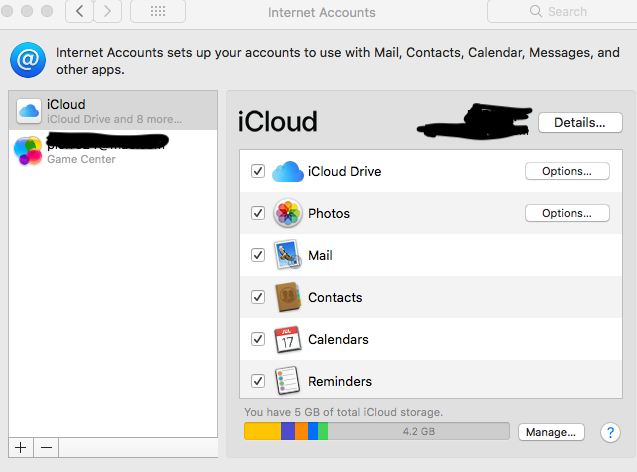 "'Details' Internet Accounts preferences?: Yes, I have iCloud enabled. I have 7 other internet accounts as well, but the details button mysteriously stopped working on them and seems to be back to normal for now."