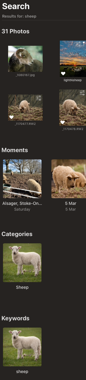 Photos app, restricting search to Keyword only.