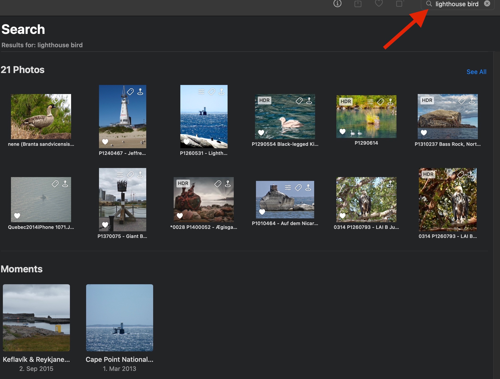 But I was able to get it to display: photos with both single-word keywords AS WELL AS photos with the 1 two-word keyword this by putting quotation marks around the desired keywords, OR reversing their order without quotation marks:
