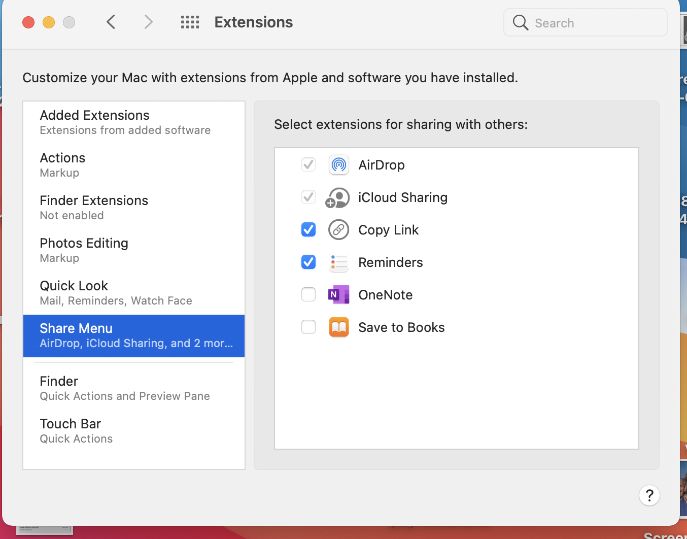 I have Big Sur, and now iMessage and Mail don't show up on my share sheet. WHen I go to System Preferences/Extensions/Share Menu, neither Messages nor Mail are listed at all. Can you help me get those extensions back?