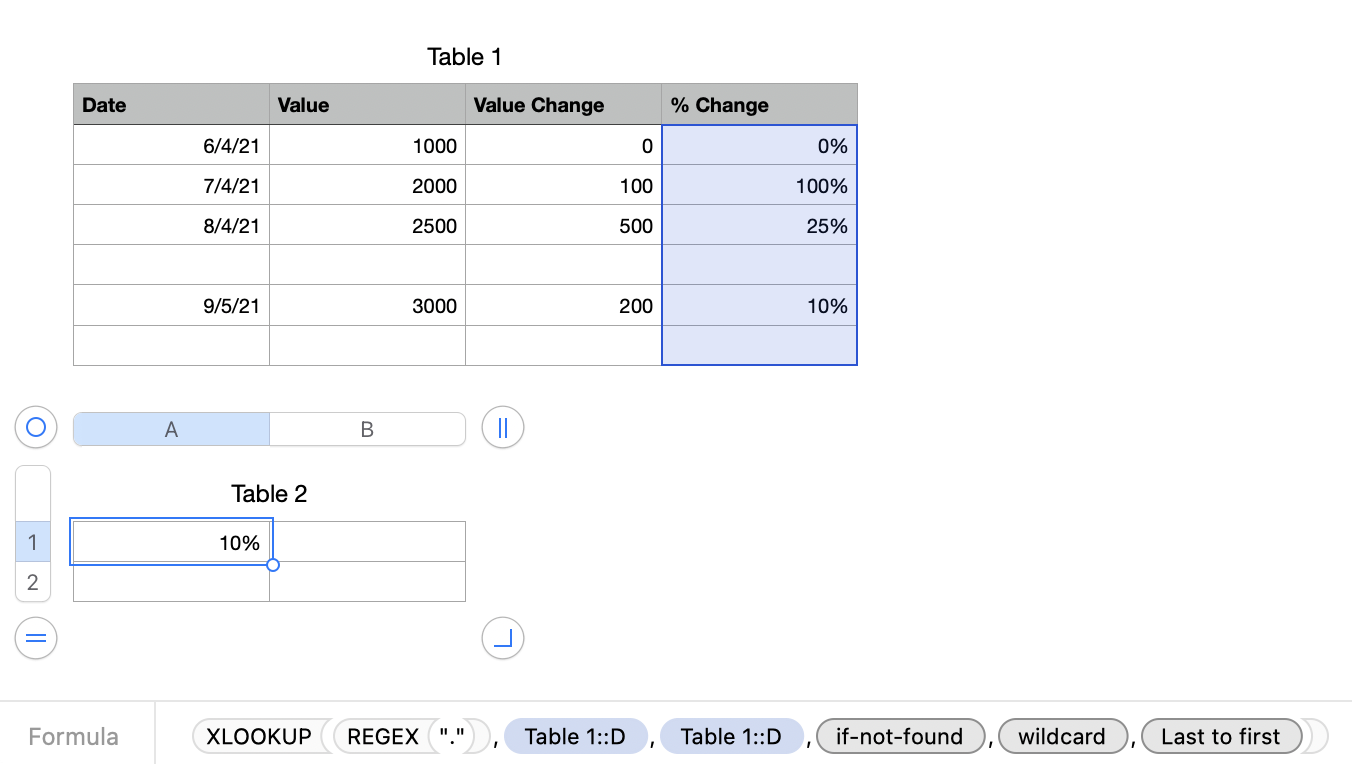 CELL A1: [always the last value from the 'PERCENTAGE CHANGE column in Table 1 - updating when ever a new row is competed in that column].