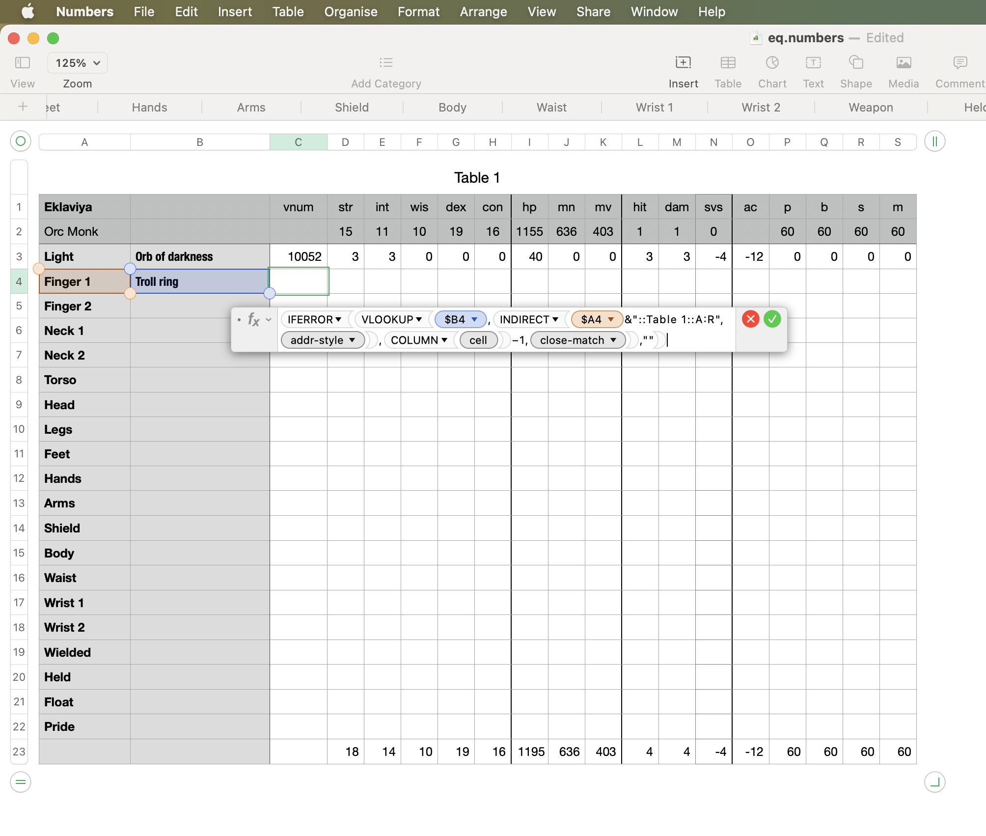 I have a document with multiple sheets, each sheet has a table containing category options and their specifications. One sheet in the same document needs to pull the specifications for the various categories, so that various combinations can be assessed.