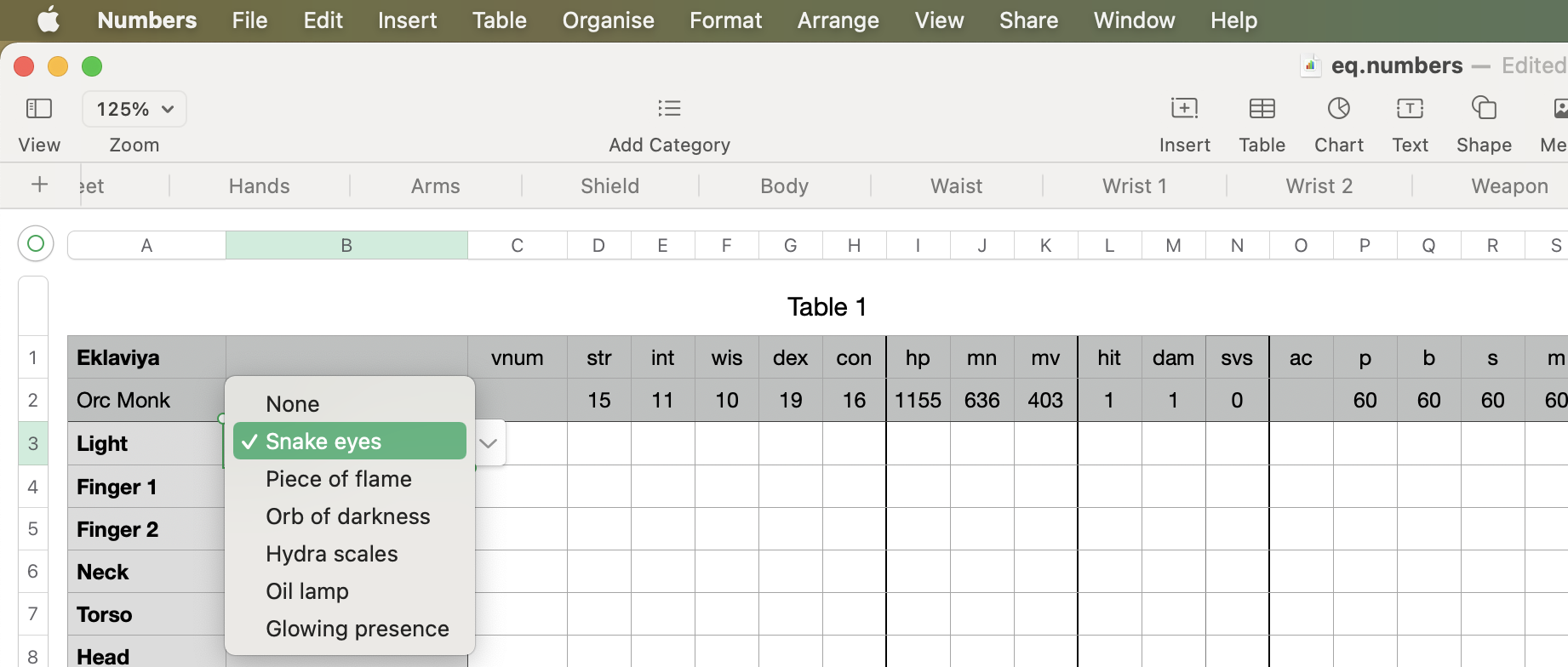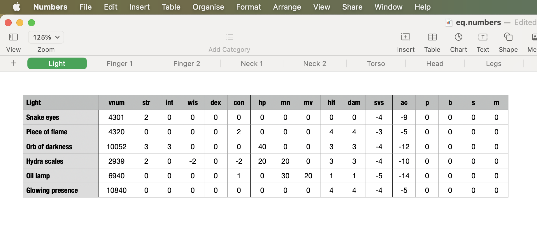The category is LIGHT, and the options are Snake eyes, Piece of flame, etc. The specifications of each option are on the row of the option.