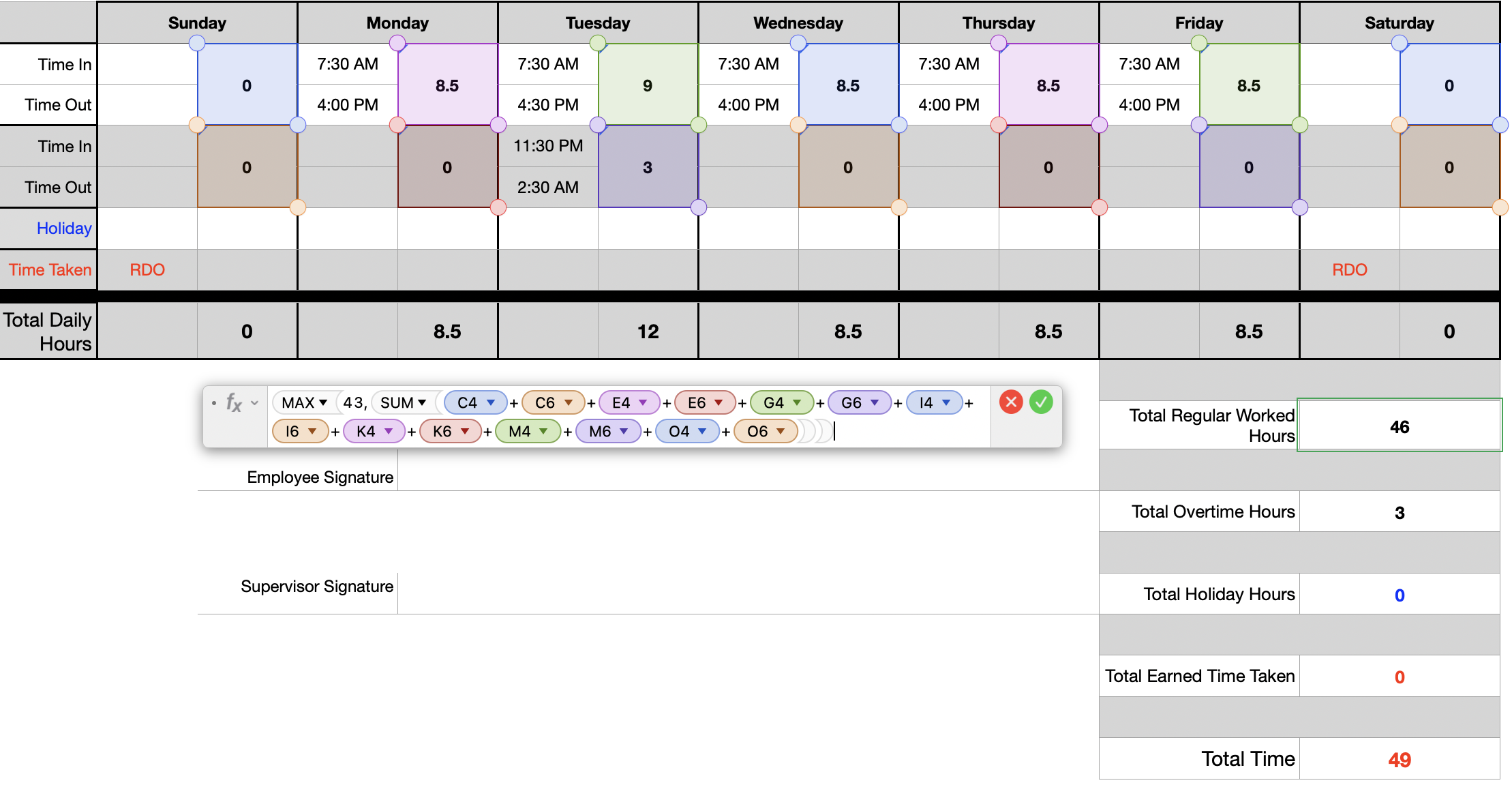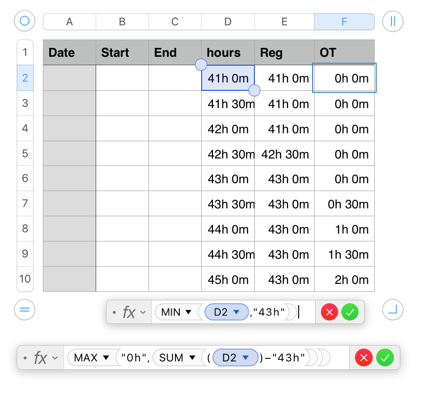 I am attempting to make a time sheet that calculate hours work and have the ability to separate the sum of the hours worked into two categories. I receive regular pay up to 43 in a given work week. Any hours over 43 are overtime hours. I type in my start and stop time for the work day and have a duration subtotal in the adjacent cell. I want to have two cells, the first displaying regular hours worked that sum all the duration hours but would like it to have a maximum displayed value of 43 if the hours worked equal or would exceed 43. The second cell shows the hours achieved over the 43 hour threshold, by calculating all the duration hours then minus 43 and it displays those hours above 43. I have attempted a MAX formula, but the value is constantly displaying value greater than 43 rather than just displaying 43 if the hours exceed it.