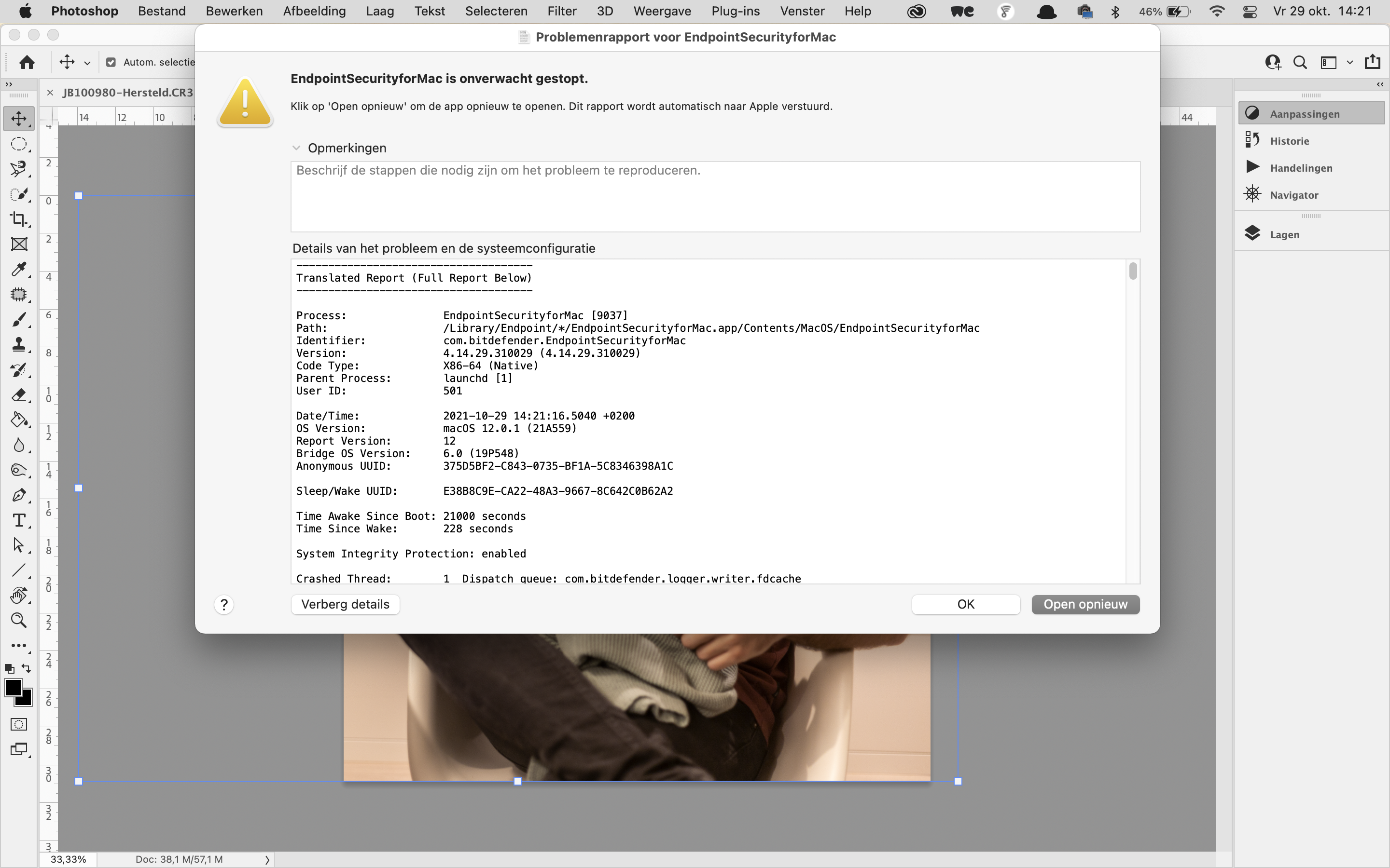 Sinds de upgrade naar os Monterey krijg ik een popup met de melding dat de endpointsecurityformac onverwacht gestopt is en deze popup verdwijnt niet. In het pad wordt verwezen naar Bitdefender en deze staat niet op mijn mac en heb ik er zelf nietgeze
