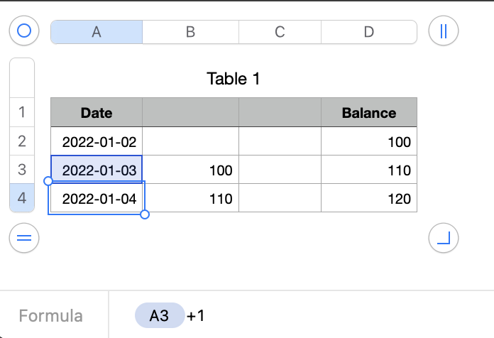 A better process might use an Applescript routine to collect the needed values, sum then, add a new row to the tale for the new date, and insert date and the sum for that date into their respective cells.