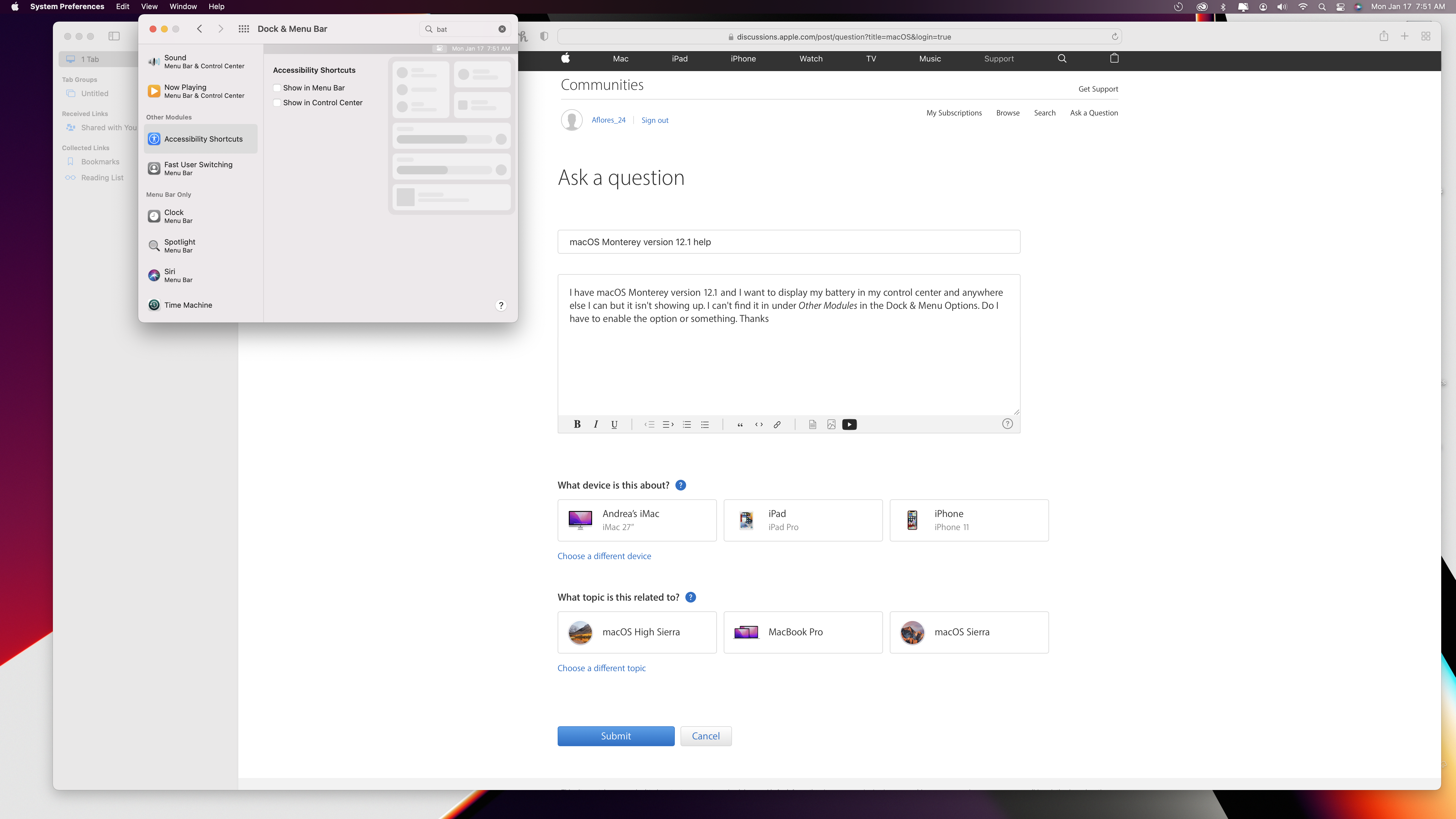 I have macOS Monterey version 12.1 and I want to display my battery in my control center and anywhere else I can but it isn't showing up. I can't find it in under Other Modules in the Dock & Menu Options. Do I have to enable the option or something. Thanks