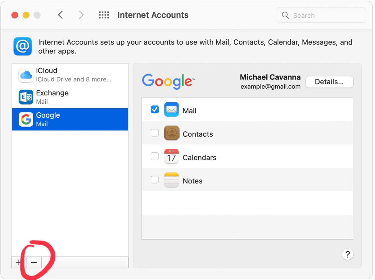 System Preferences… Internet Accounts… Select the account, and delete (circled in red) it…
