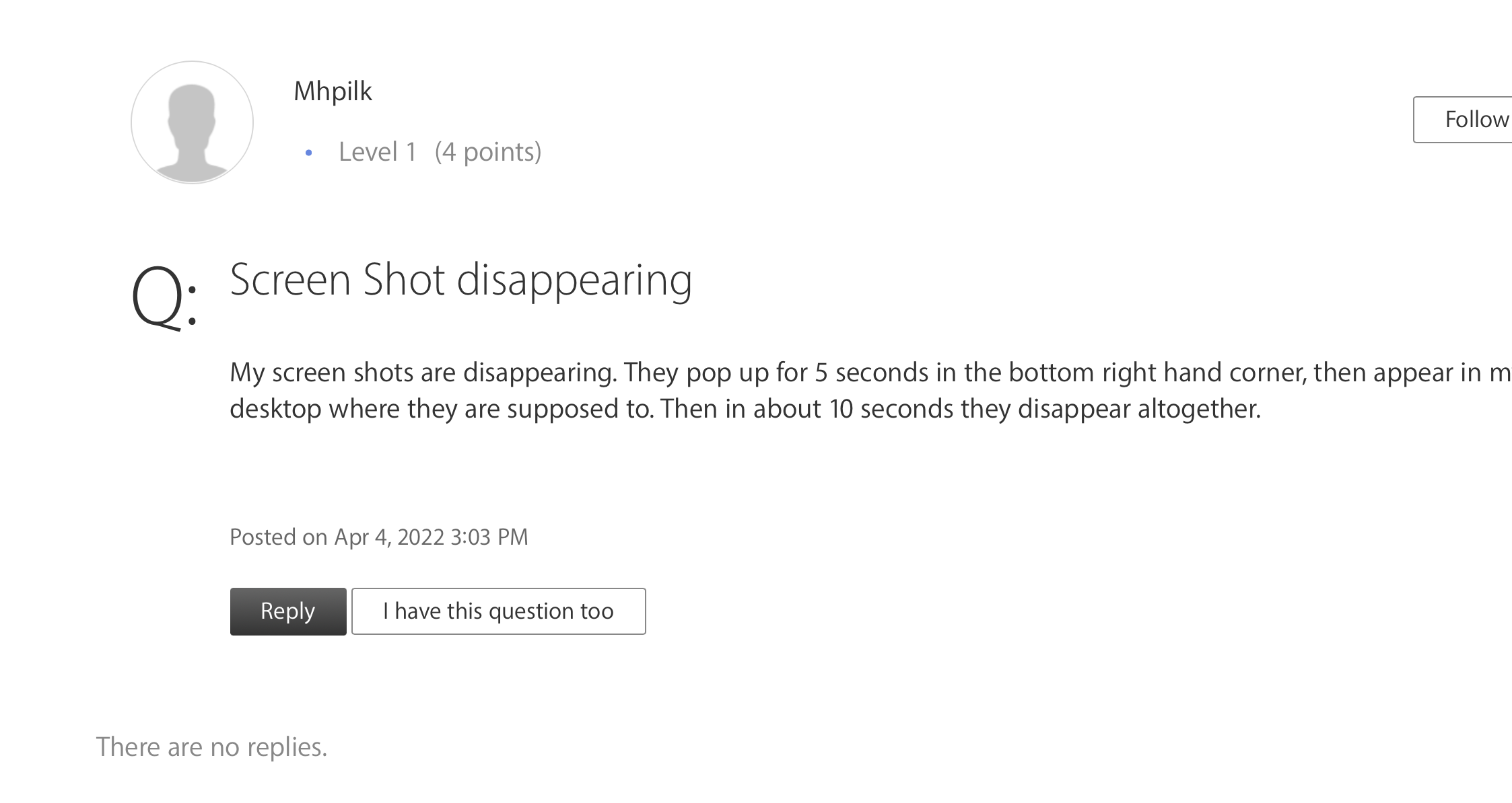 My screen shots are disappearing. They pop up for 5 seconds in the bottom right hand corner, then appear in my desktop where they are supposed to. Then in about 10 seconds they disappear altogether.