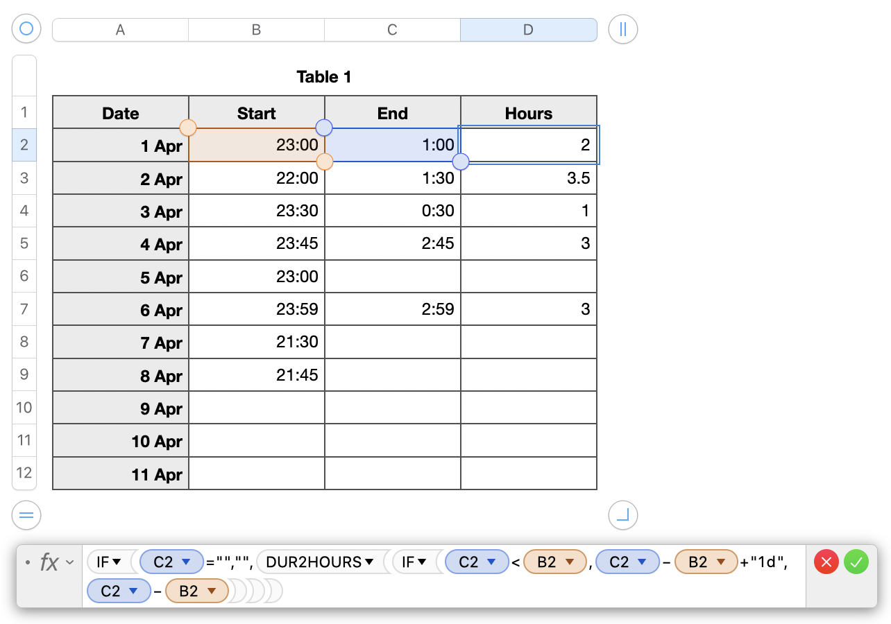 I would like a formula to caculate the number of hours between 2 times. With a start time before midnight and an end time after midnight .ie:If cell B2 is start time & cell C2 is an end time next day I want cell D2 to give me total hours in digital format. I am using Numbers 12.Any ideas please