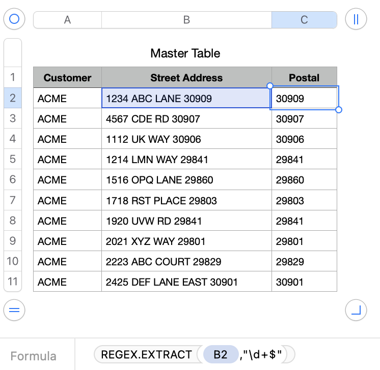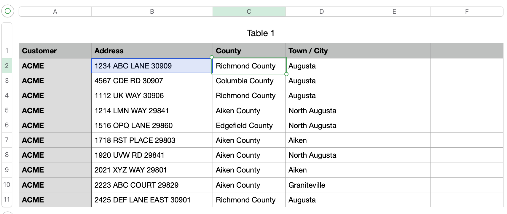 Example. 30909 populates into a cell next to a cell labeled Augusta.