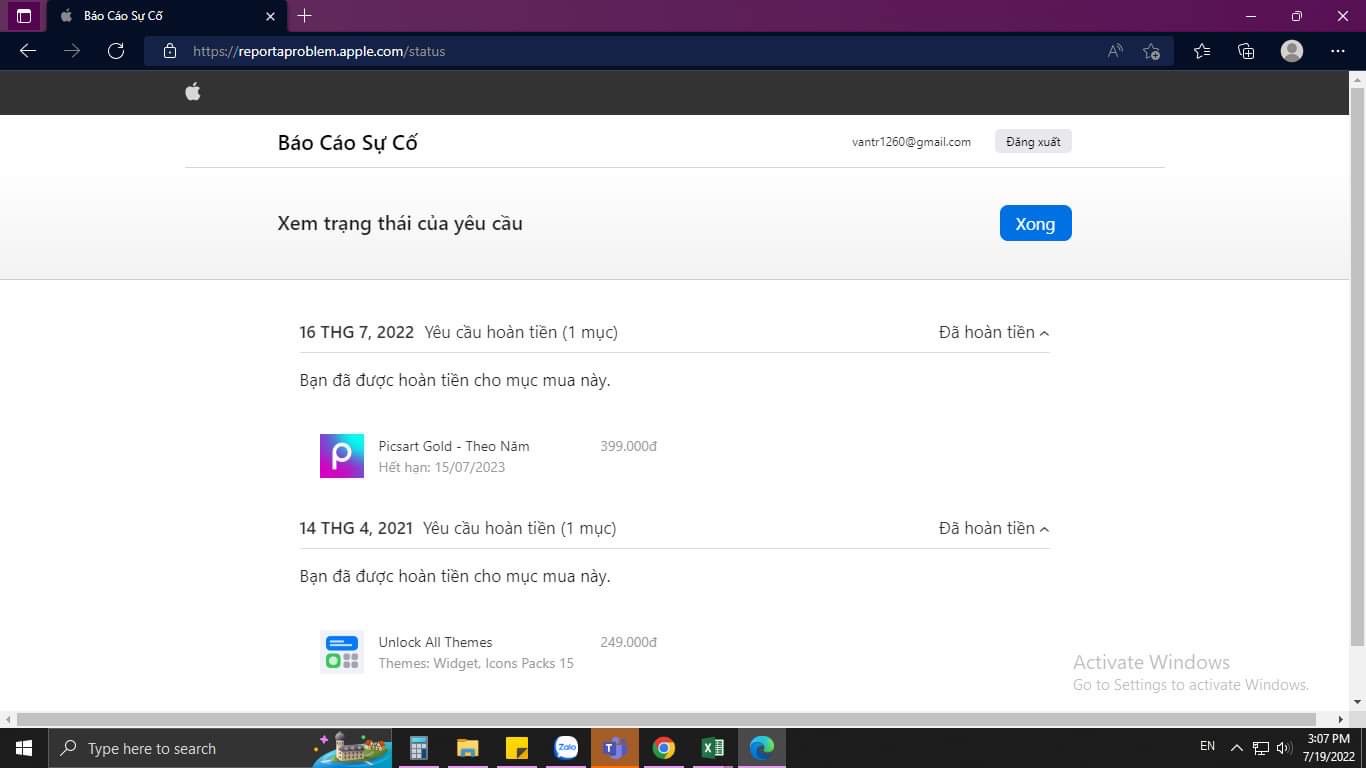 Hi! I have downloaded the PICSART application to my device and this is an application that charges a subscription fee. When I used it, I was told to try it for 7 days for free, then it will be charged an annual fee of 399,000. On July 16, 2022, I clicked register, Apple deducted VND 399,000 from my credit account and I sent a refund request. Up to now, Apple has accepted its refund request and said it has refunded. However, when I went to check my bank account, there was still no money transferred to my account.