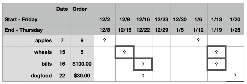 The formula is entered in the selected cell, D4, then filled down to the bottom of the table (as many rows as needed) and filled right for as many weeks as needed.