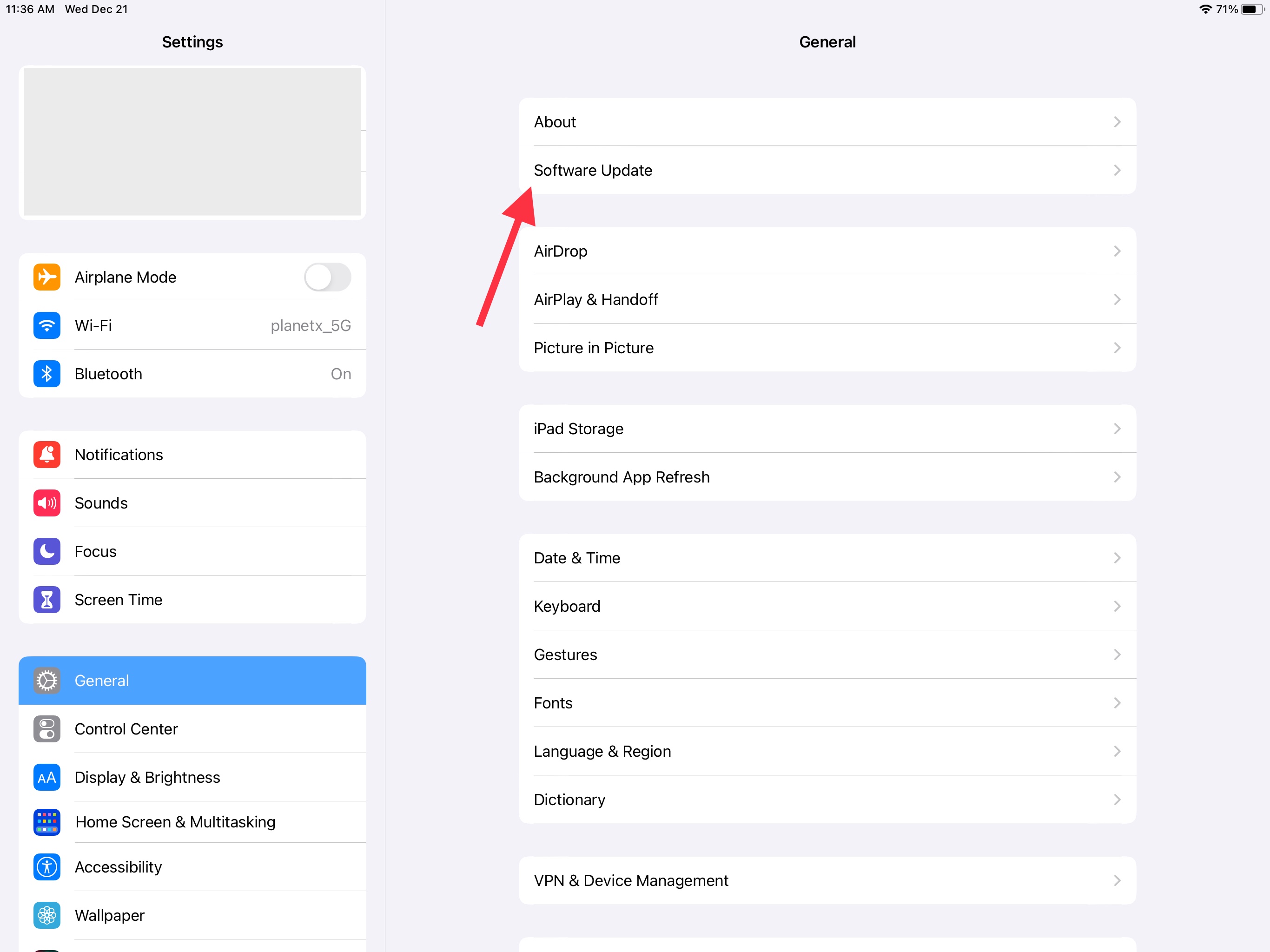 My iPad 6th generation does not show the software update option, what can I do to update iOS?