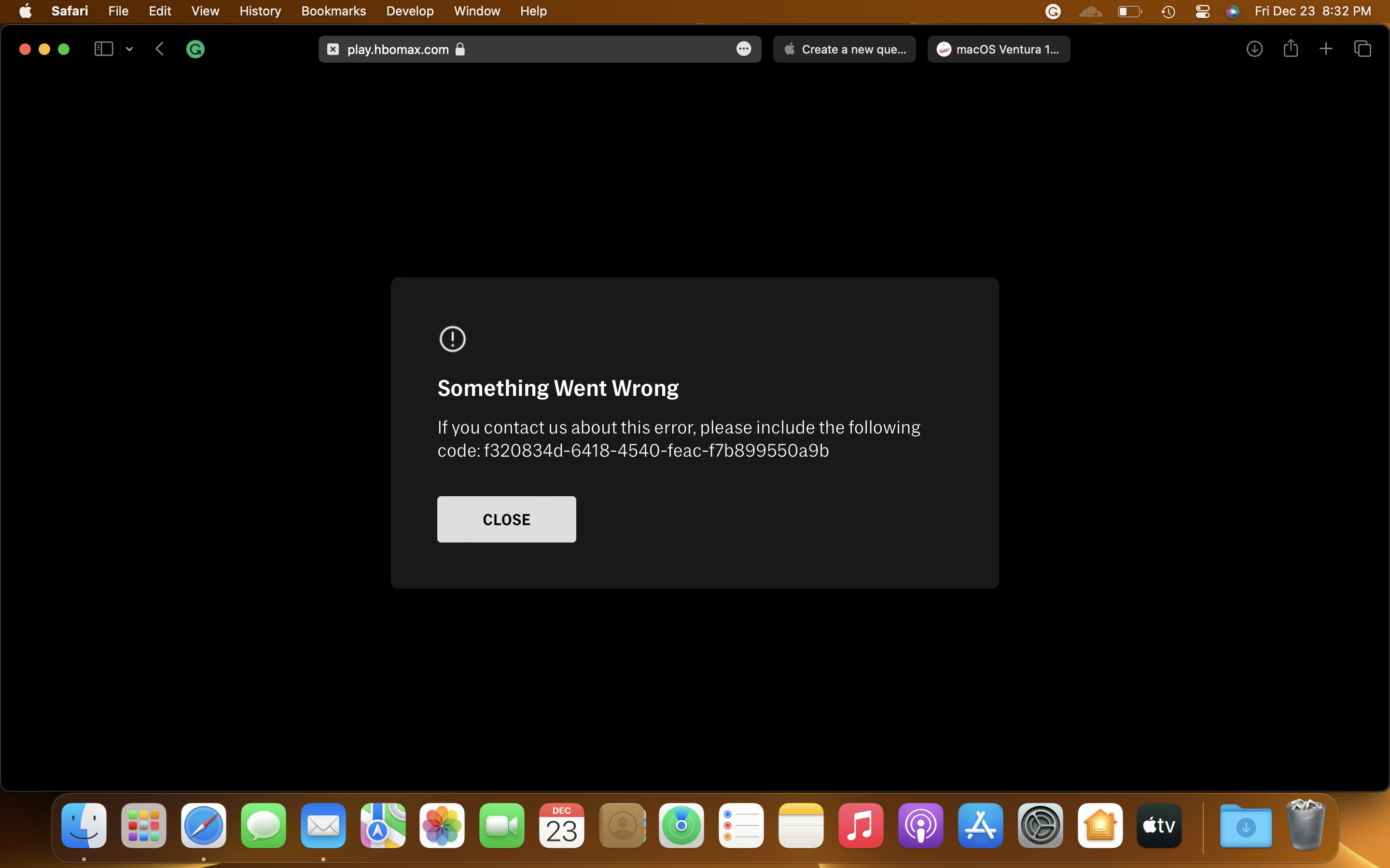 My Safari 16.2 on MacBook Pro 2016 (Ventura - 13.1) doesn't play HBOMax videos. Every time I press play on a TV show or movie, it brings up an error. This doesn't happen in Google Chrome or Mozilla Firefox, but I prefer safari. I have tried turning off all my extensions, switching Auto-play on and off, signing out of my HBOMax account, restarting my Mac, and reinstalling the entire operating system. Please help!