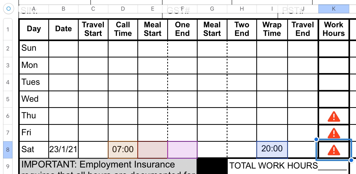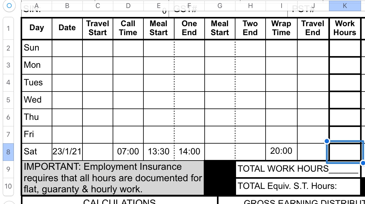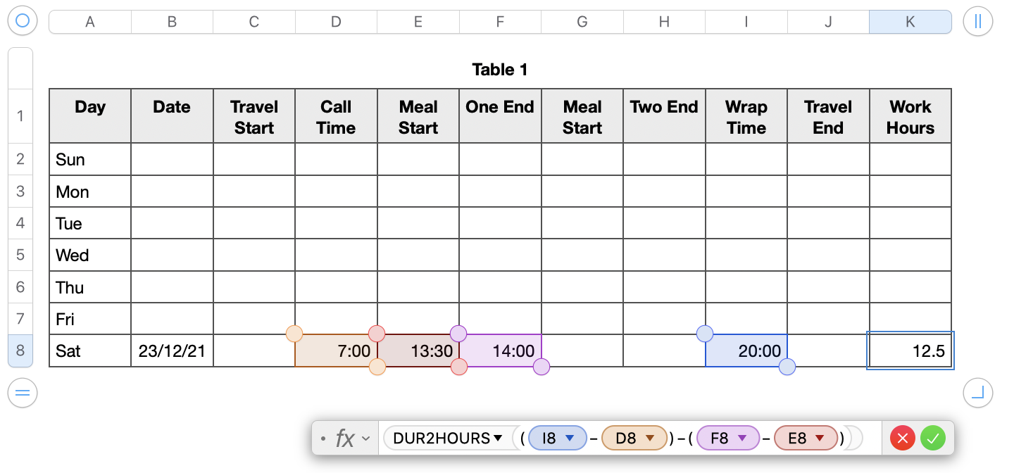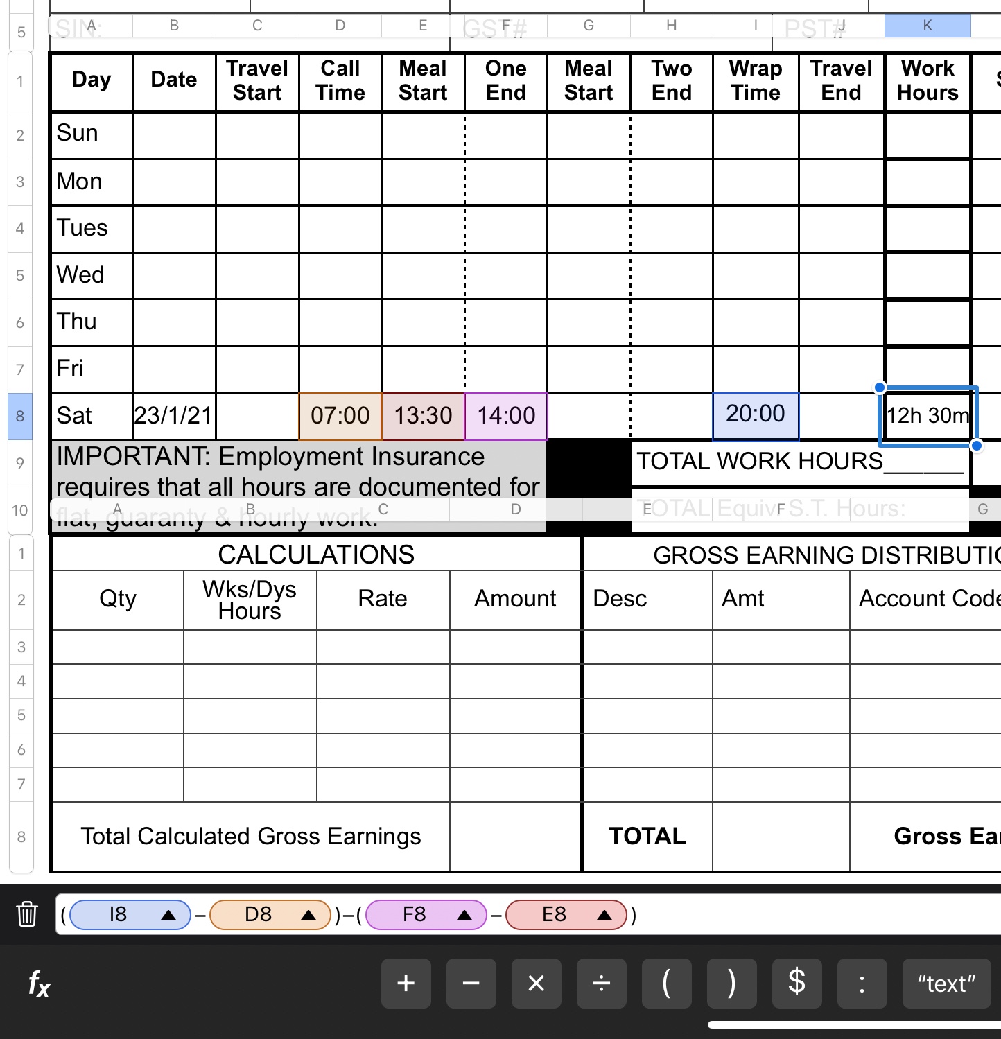 I would like K8 =(End Time - Start Time)-(Lunch end -Lunch Start) ?