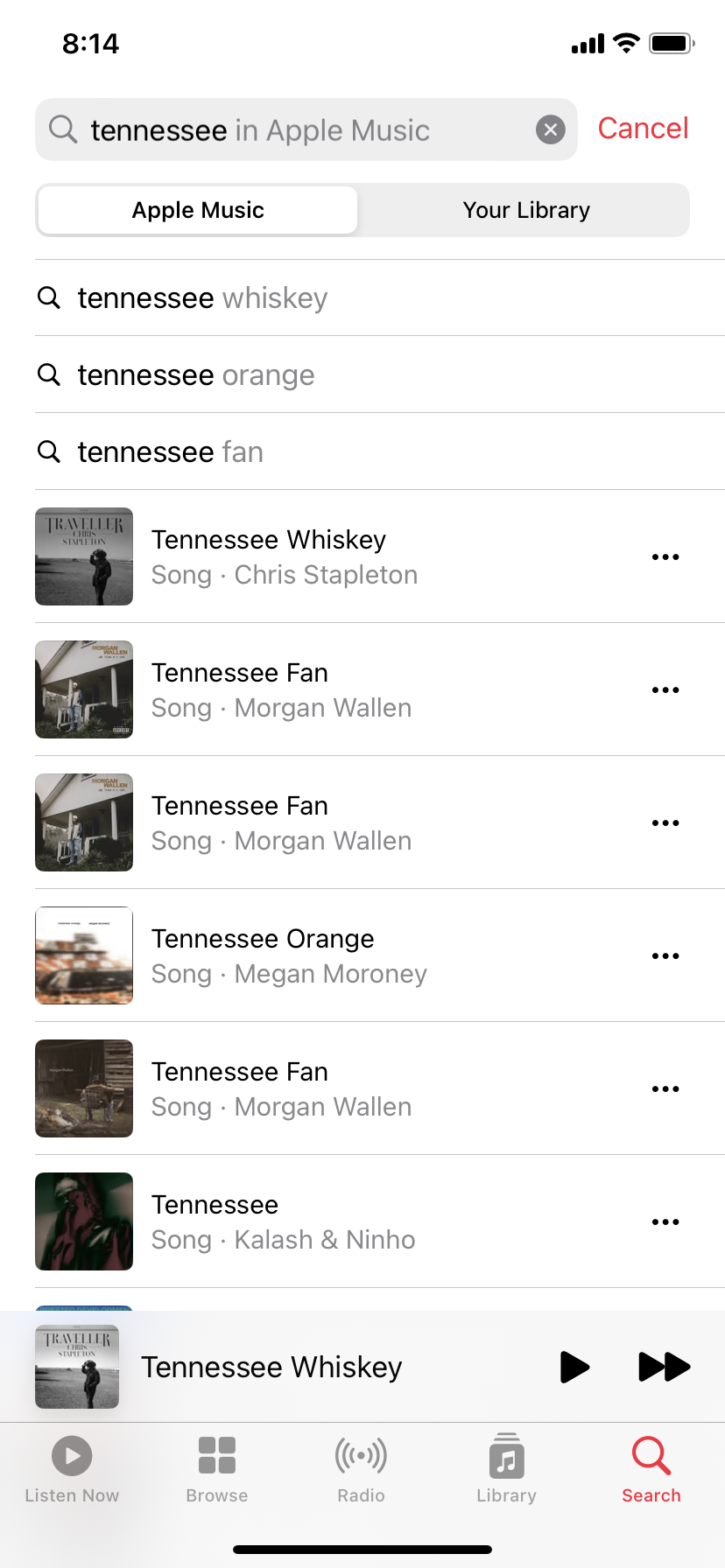 I have been coming across a bug with Apple Music on iOS. When I search for a particular song, in this case, “Tennessee Whiskey” by Chris Stapleton, the song appears in the now playing bar but never actually plays. Similarly, if I ask Siri “Play Tennessee Whiskey by Chris Stapleton”, she responds with “Looks like Apple Music can’t play that”.