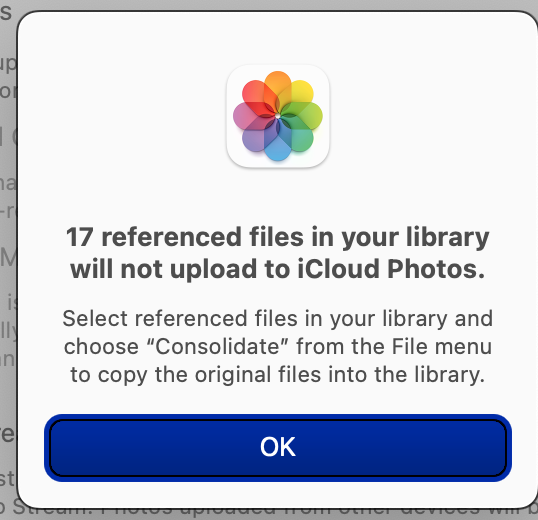 My photos library does not have any referenced files, per the Photos app file menu. iCloud photos is currently off. However, when I go to preferences, iCloud, and check the iCloud Photos button, I get a warning that 17 referenced files in my library will not be uploaded to iCloud. How do I clean up the mismatch about referenced files? I have already performed the Photos database repair/rebuild, but that did not fix the problem.