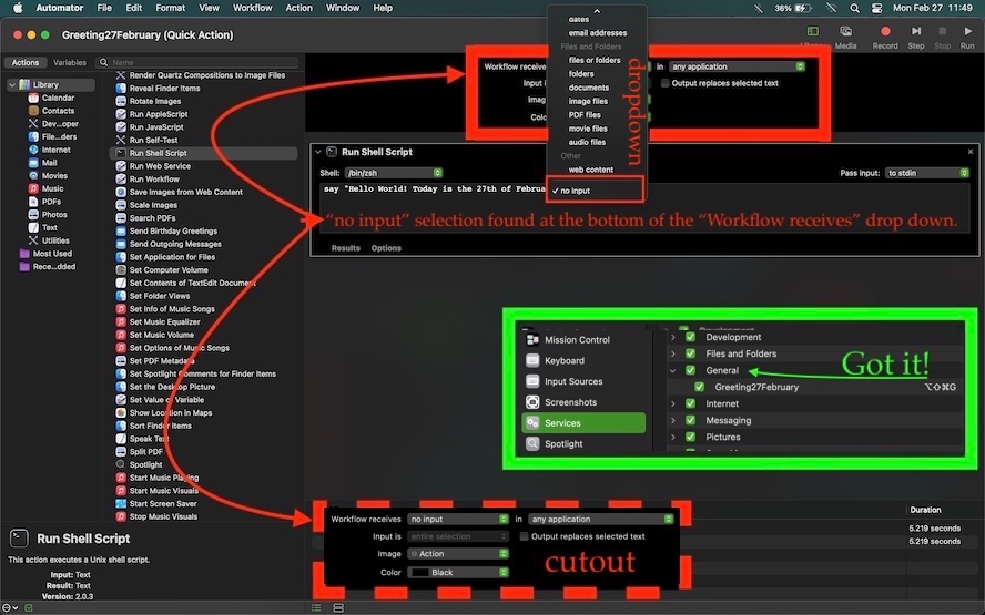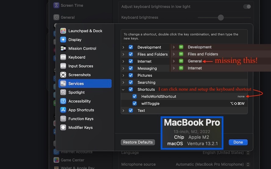 I'm trying to set this up on my new 13" M2 with macOS Ventura. I could find no easy solutions for assigning a keyboard shortcut to this quick action, so I tried adding it to the touch bar.