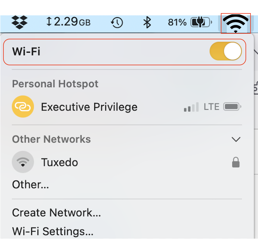 Yeah, I know, I can just click my wifi symbol on my menu bar, and if my cursor is in close proximity to it, I usually do. But I prefer either a keyboard shortcut or a task bar item that works than to have to drag my cursor all the way across the screen to get there.