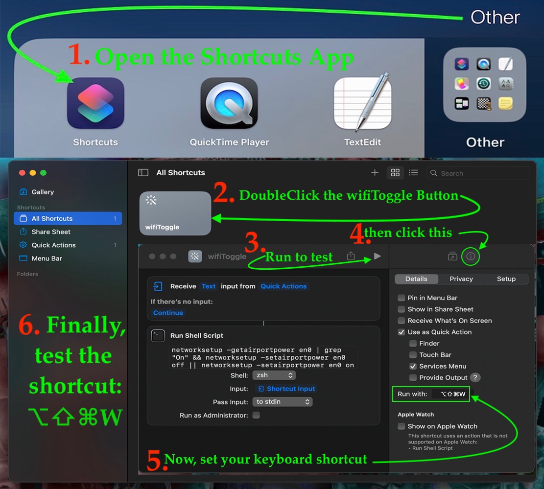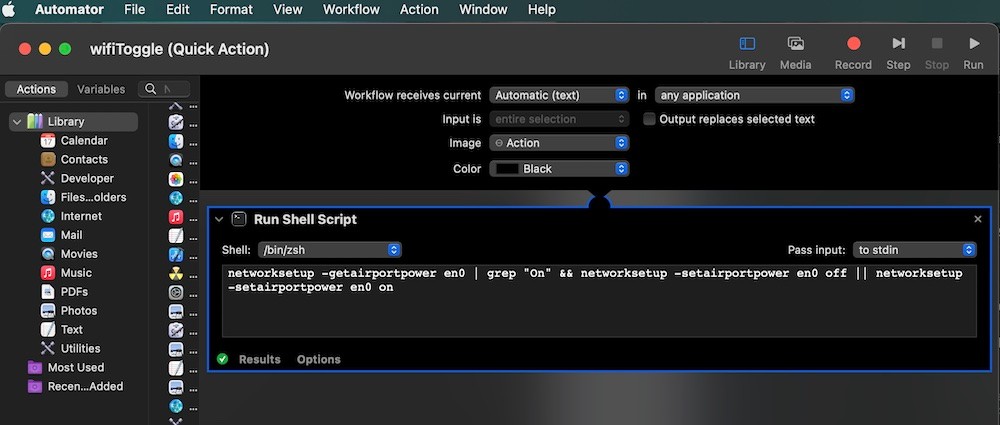 On my older intel MacBook I was able to create the same wifiToggle and assign a keyboard shortcut to it to easily toggle my wifi on and off.