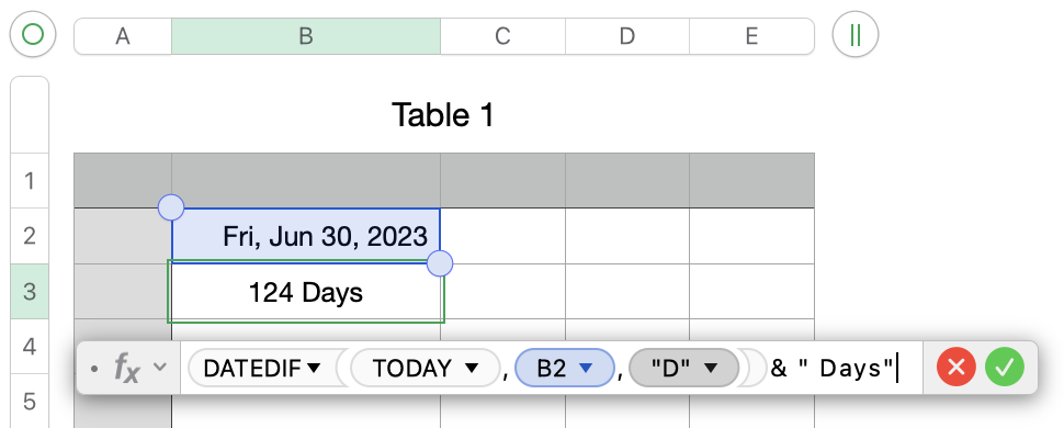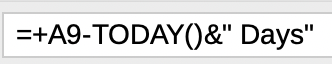 Formula for B3= DATEDIF(TODAY(),B2,"D")& " Days"