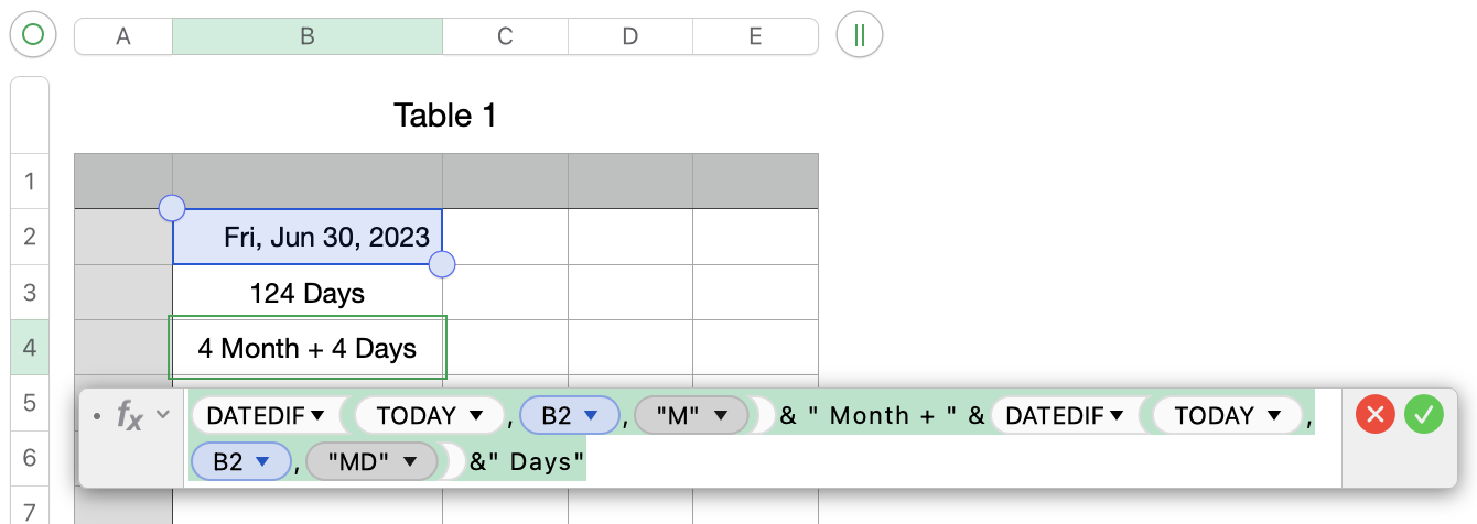 Formula for B4= DATEDIF(TODAY(),B2,"M")&" Month + "&DATEDIF(TODAY(),B2,"MD")&" Days"