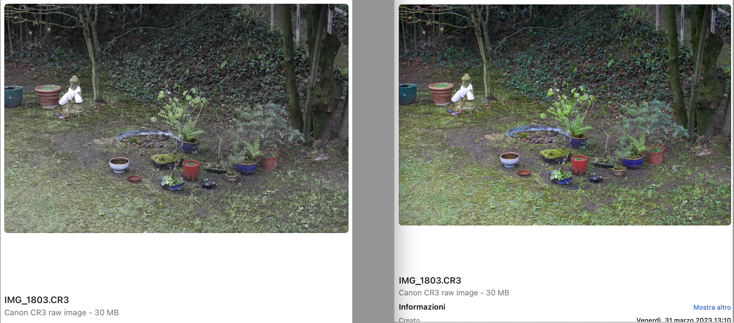 If I open both images with the Preview.app, both are equally oversaturated and match the left one above. If I import the picture in Photos.app it stay oversaturated. To get it appear "correctly" (e.g. as it does in Canon's own app "Digital Photo Professional" for instance) I have to open it with the RAWPower plugin and set the Vibrancy value to approx to -0.4. If at this stage I export a JPG version of the picture with "original color profile" set in the export dialog, I obtain a "correct" looking image with an sRGB IEC61966-2.1 profile associated...Rather weird. But the plot thickens further: I repeated the whole test with a CR2 Raw picture shot with a Canon EOS 70D, and guess what? The file shows consistently under all circumstances, not oversaturated at all, and by default it shows in Photos.app exactly the same as in Canon's own utility. All this happens to occur in spite of the color profile association which is exactly the same on CR2 files as with the CR3 file... I suspect that the problem is rooted at the RAW decoding/processing/interpretation done by Apple which is different by camera model, rather than by the sRGB / P3 discussion which was subject of the previous thread.
