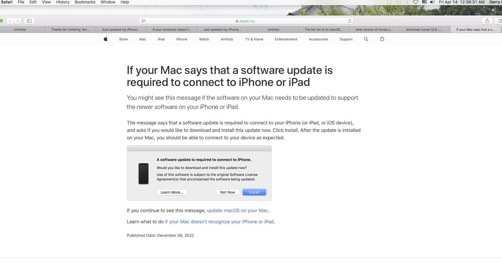 • After logging back into my Mac Pro, I plugged my iPhone 12m back in using the same cable as before- and immediately a SOFTWARE UPDATE IS REQUIRED TO CONNECT IPHONE pop-up window appeared.