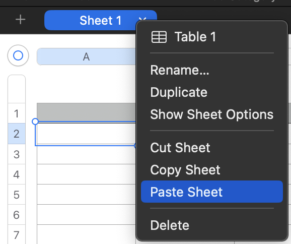 Switch to the new document that you are going to share and choose Paste Sheet: