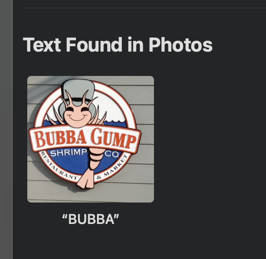 Searching for Live Text is really working well in Photos 8 on macOS 13. Even if the text is curved or "All caps". For example, searching for the word "bubba".
