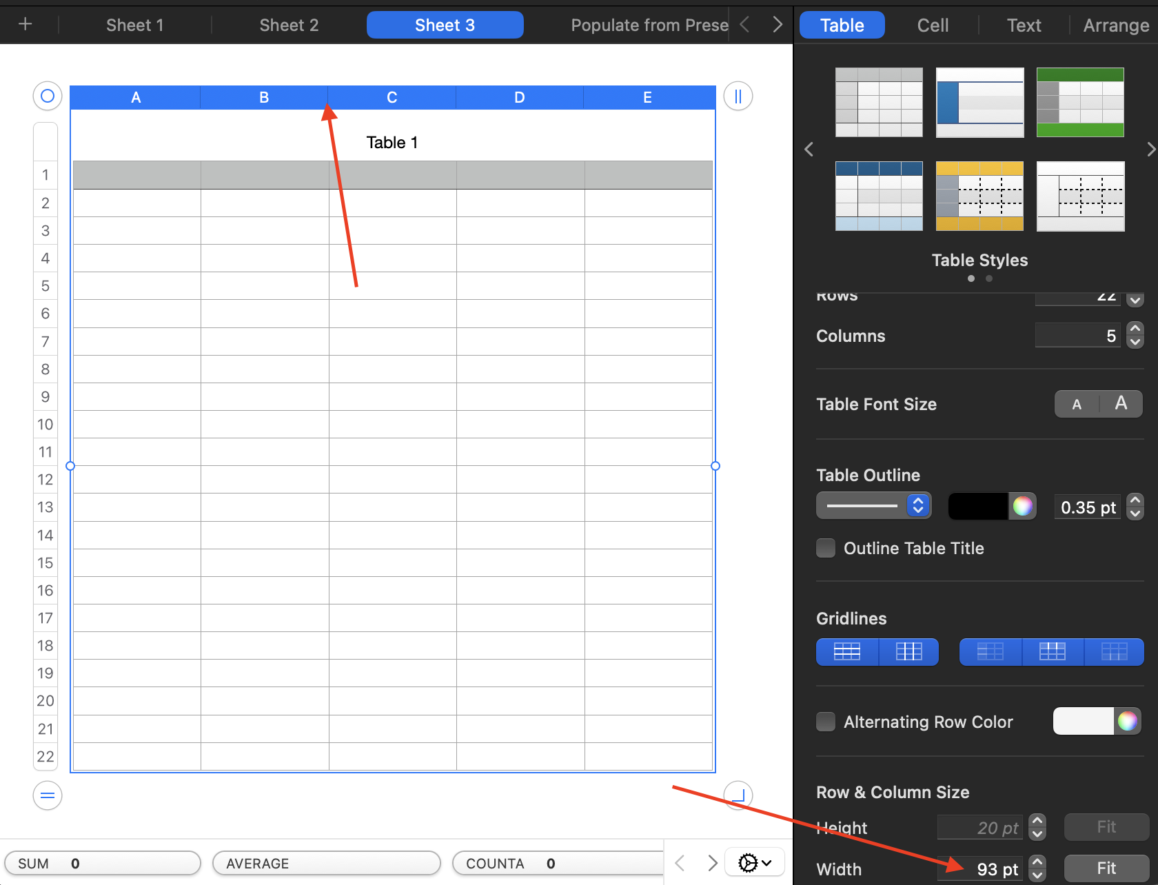 2- Select the columns you want to widen and change the value in the Width box in the right sidebar.