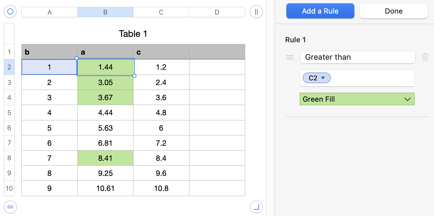 to use a cell reference. A cell reference lets you compare the cell’s value to another cell—so, for example, you can highlight a cell when its value is greater than another cell’s. Click a cell to select it, or enter its table address (for example, F1)."