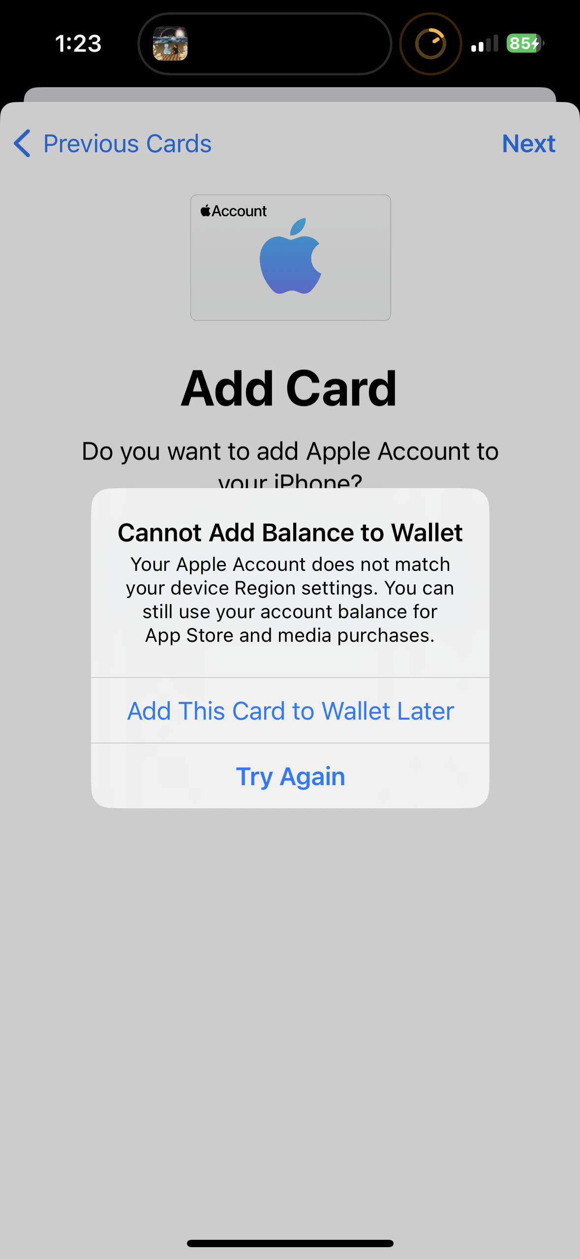 I keep getting the following error whenever I try to add the account balance card to my wallet.