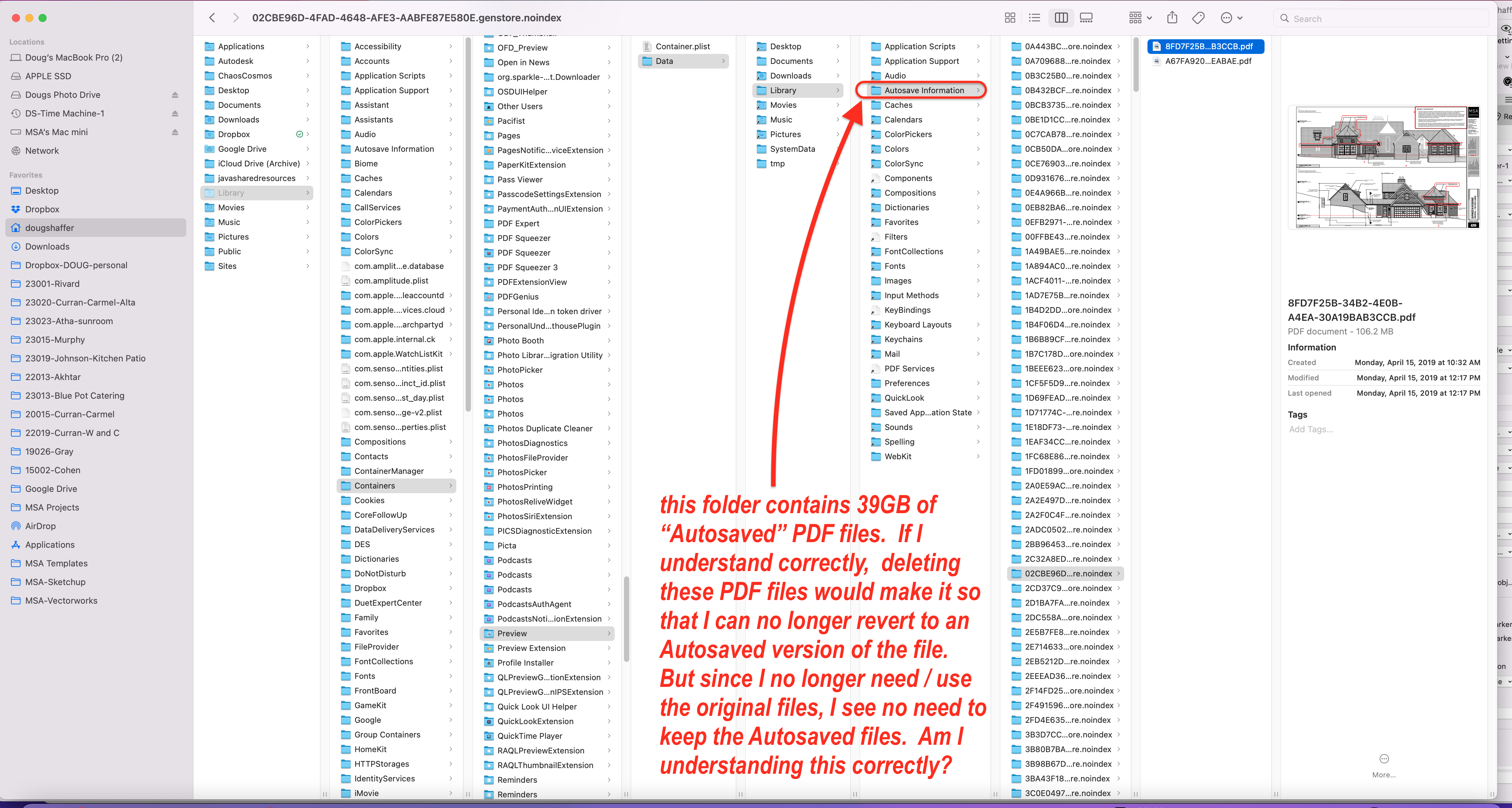 I am using Monterey, not Sonoma, so perhaps the difference between my system and yours. Attached is a screen capture showing the full file path of one of the "Autosave Information" folders I'm referring to. This folder contains are 39GB of PDF files that I do not need to refer to in the future. It seems to me that deleting the contents (all of which are PDF files) of the "Autosave Information" folder would not be harmful but perhaps I'm missing something.