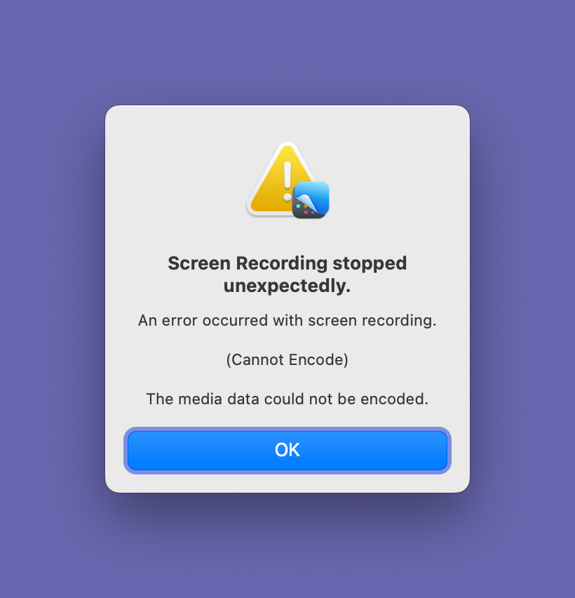 Another time, CleanShot X was also unable to record, but instead of KP-ing, it gave me the following error messages: