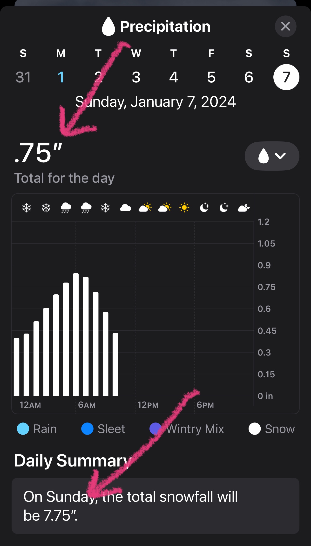 The weather app shows the precipitation forecast in two places on the screen. There seems to be a decimal error between the two. (This has been going on for quite some time.)