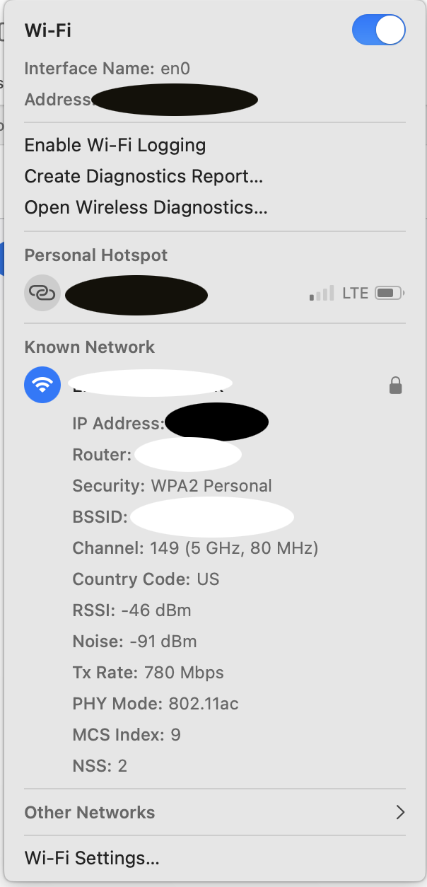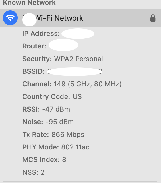 To view the basic Wi-Fi environment characteristics, Option-Click on the Wi-Fi logo 🛜 in the menu bar, and capture some Wi-Fi network data. Post the items shown in the following image including the Security mode and from Channel to NSS inclusive (Security, Channel, Country, RSSI, Noise, Tx Rate, PHY mode, MCS, NSS, green highlight) (without posting the Wi-Fi address, any local HotSpots that might be present, the network name, or the BSSID, all of which are expurgated from the image shown below, red highlight), and we can take a look at the basic network environment.