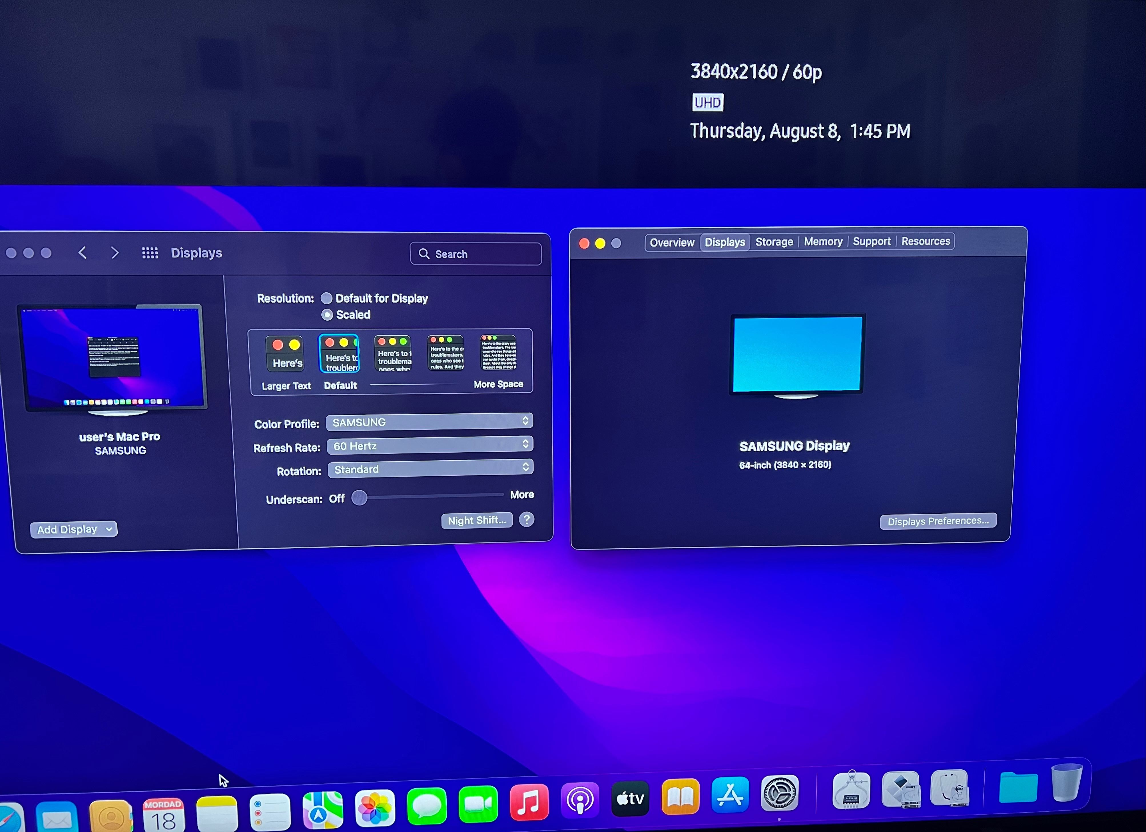 I have a 2013 Mac Pro, 64GB RAM, Intel(R) Xeon(R) CPU E5-2667 v2 @ 3.30GHz, D700 FirePro GPUs. I am trying to figure out how to get my MP to display 60Hz at 4K on my TV, which is a 65" Samsung model TU7000. This entry level SmartTV has HDMI 2.0 and is capable of 60Hz. I am running Bootcamp and have Windows 10 Pro which is up to date.
