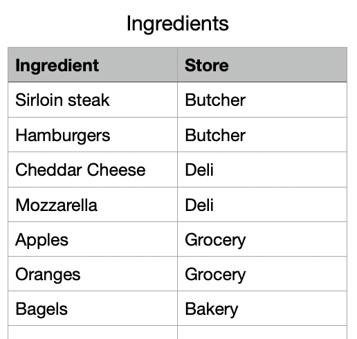 That's a whole other level of Spreadsheet wizardry. You're going to need somewhere to store (no pun intended) which ingredients come from which stores - for all the magic, Numbers is dumb and doesn't inherently know that Steak comes from the butcher and bread from the bakery - so you're going to have to tell it.
