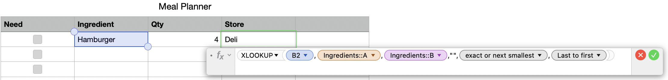 =XLOOKUP(B2, Ingredients::A, Ingredients::B, "", -1, -1)