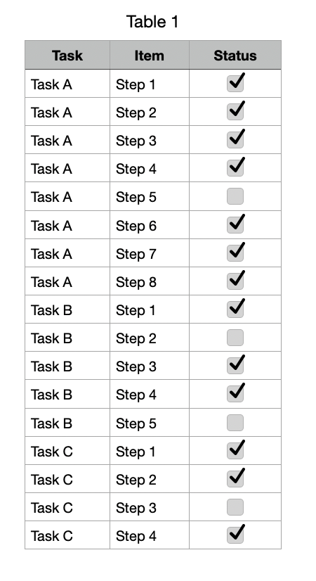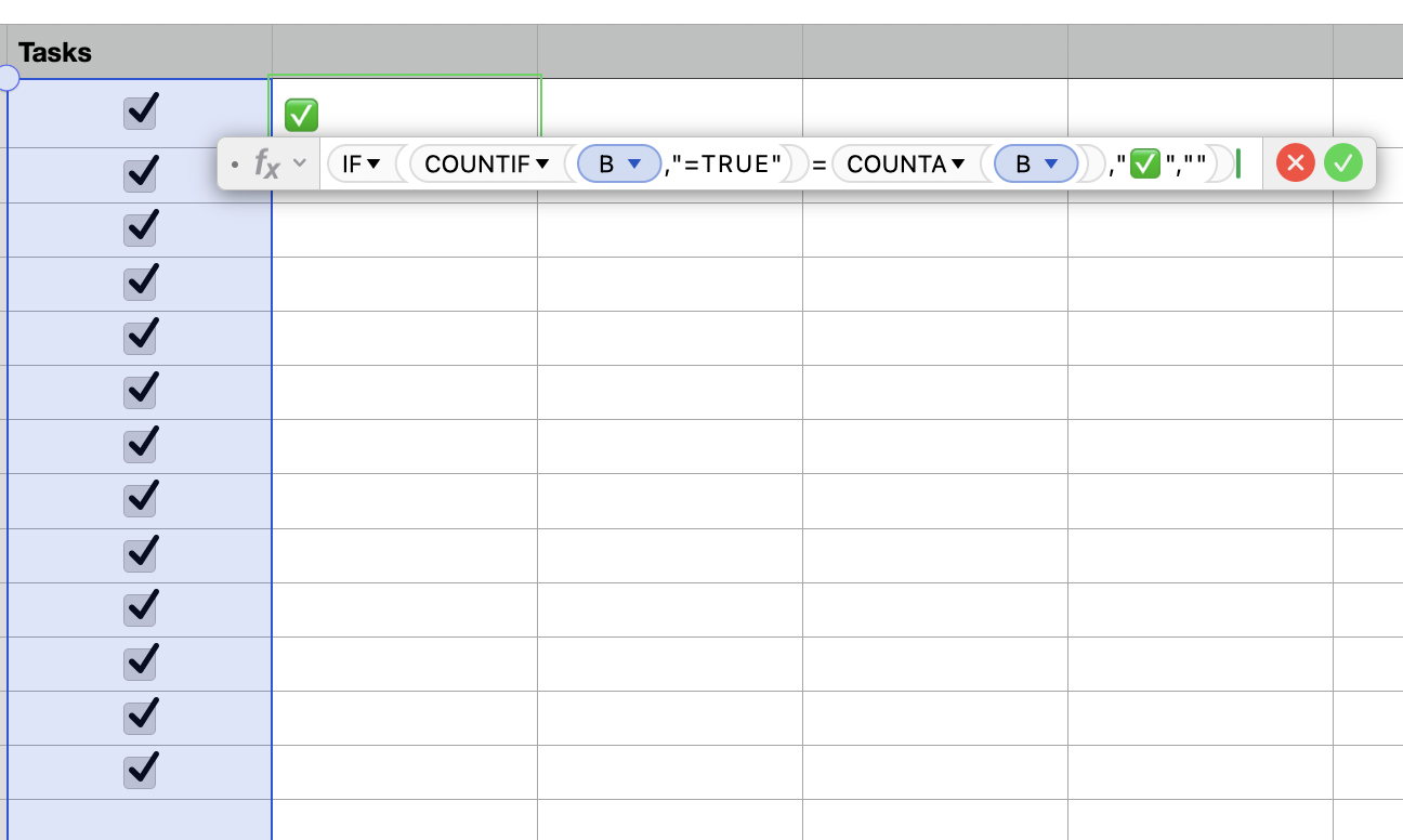 Is it possible to make it that, when all of the Tasks are done in First Work Steps are done it automatically Checks of the Tasks maker in the Checklist Main Cell, so I have an overview when i forget a step in one of the different Checklists. Or is there an easier way to make this work, i don't want to have a huge checklist over one Spreadsheet, because it gets very confusing over time.
