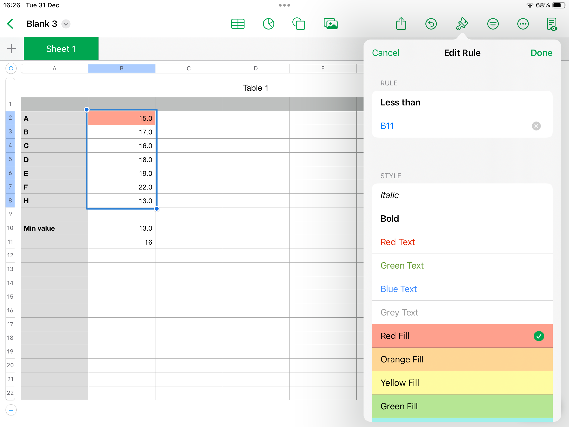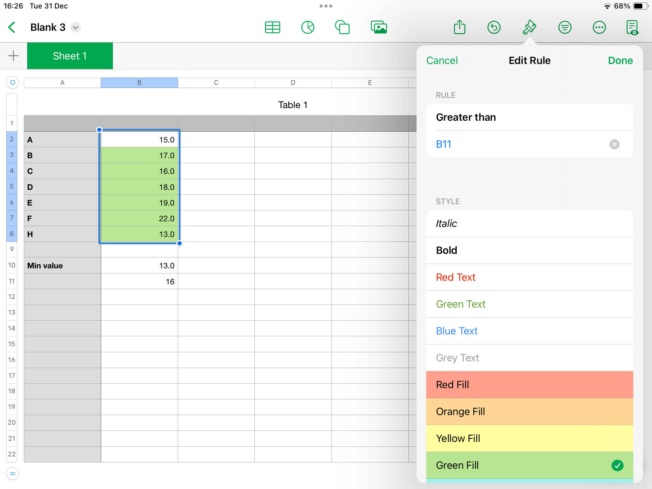 Another test to check the greater than option, incorrectly highlighted cells B4 and B8, as the value 16 should only be highlighted if the condition was “greater than or equal”
